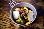 (3)エリンギ、かぶ、玉ねぎ、なす、を入れて全体に油がまわるように1−2分炒めたらキャベツ、にんにく、調味料Aを入れ蓋をする。弱めの強火で加熱し、蓋から蒸気が漏れたら弱火に落として50分煮込む