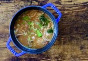 (2)お湯を沸かして小鍋に注ぎ、花がつおをいれ、煮立たせて2分ほど具材を茹でたら火を止めて味噌を溶かす